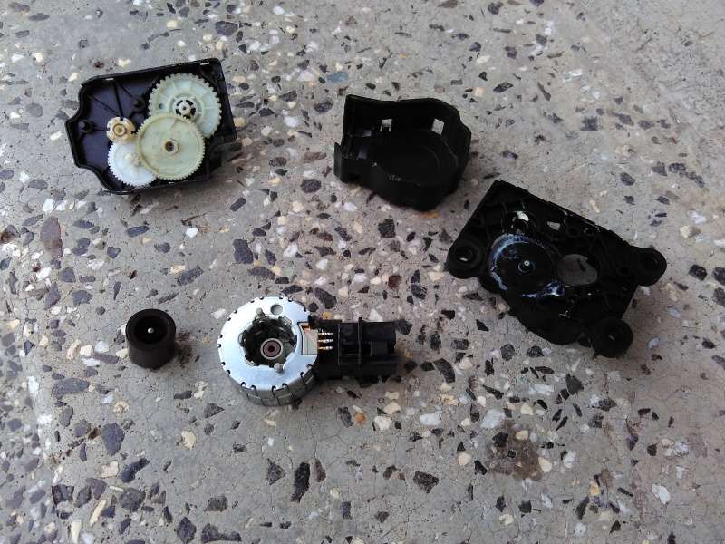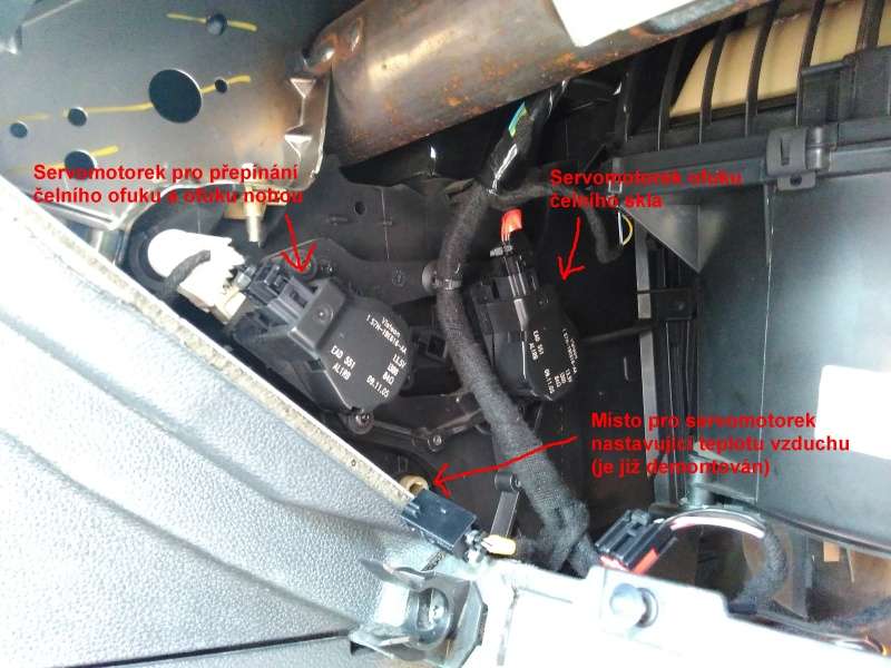 Takže jsem se pustil do opravy topení... Jak se dostat k servomotorkům, co ovládají klapky, je celkem snadné, stačí vycvaknout kastlík a jste tam... Uvidíte tři motorky, horní dva ovládají směr proudění vzduchu (nohy, čelní, sklo) a spodní servomotorek ovládá teplotu vzduchu... Právě na tomto jsem jsem hledal závadu, takže jsem ho demontoval, rozebral, namazal převody, okem zkontroloval, zdál se být vpořádku, takže jsem ho opět smontoval, stále šel blbě, jakoby v něm pouze škubalo, ale plynule otáčet se nechtěl... Zkusil jsem na něj připojit konektor z jiného servomotorku a najednou šel bezchybně... Na jeho původní konektor jsem zkusil připojit jiný servomotorek a taky docházelo pouze k záškubům.. Takže problém nalezen, je to buď přerušený vodič, nejspíš u konektoru, (v konektoru je celkem 5 vodičů), nebo je špatný panel climatroniku, který posílá na konektor servomotorku teploty vzduchu špatný impulsy, kdy dochází pouze k záškubům, namísto plynulého pohybu otáčení klapky.. Takže teď babo raď, můžu zkusit rozebrat panel, mrknout se zezadu na climatronik, kde uvidím nejspíš prd, nebo zkusím objednat starší panel z vrakáče, cena se pohybuje od 800Kč do 2000Kč... A doufat, ve funkčnost, jinak to bude v kabeláži... Přikládám nějaké foto, snad to bude někomu užitečné...