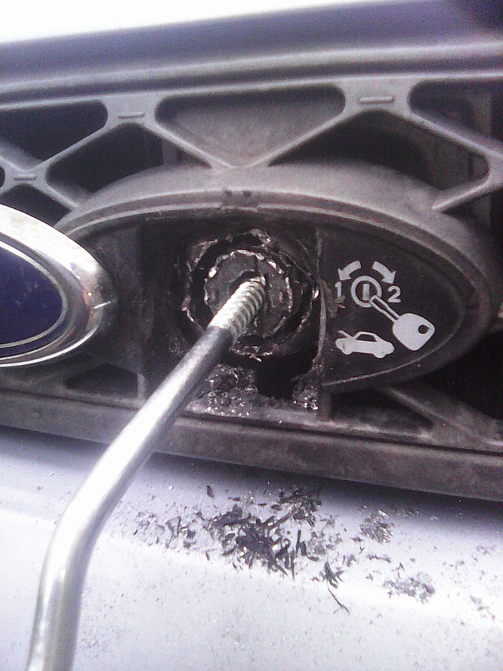 Zavolal jsem do servisu, kde řekli jen "Ajajaj". Přijel jsem tam, koukli jsme spolu do sousedního Fokuse a žádný rozumný nápad neměli. Rozhodl jsem tedy, že budu jezdit bez zámku a otvírat haubnu šroubovákem. Postupoval jsem tedy zepředu , kde jsem zámek obvrtal okolo, našrouboval jsem do něj hák a vytáhl jsem ho dopředu. Tyčka byla v pohodě a je dokonce kovová - vyčvachtal se zámek. Díra je schovaná pod logem, otevřít se to dá křížovým nebo plochým šroubovákem.