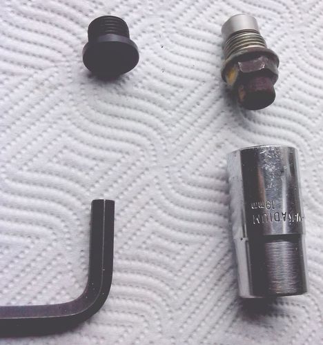 - vypouštěcí je na 19mm oříšek (použil jsem klíč na kola), tento šroub měl na vnitřním závitu nějaké lepidlo na závity proti povolování
