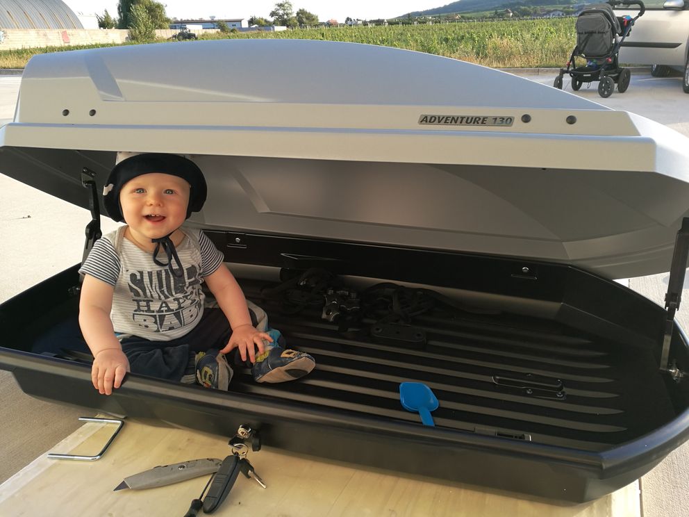 Siroke tak, ze mal pretrcajuce priecniky a box bol cca rovnako siroky (ma 123cm). Vraj tam natrepal aj vyse 100kg a ze nosnost strechy ho netrapi.... Box ma v sebe kovove vystuhy. A ze to bolo prvy krat kedy sa balili na dovolenku a vravel zene, nech este da dalsie veci do auta