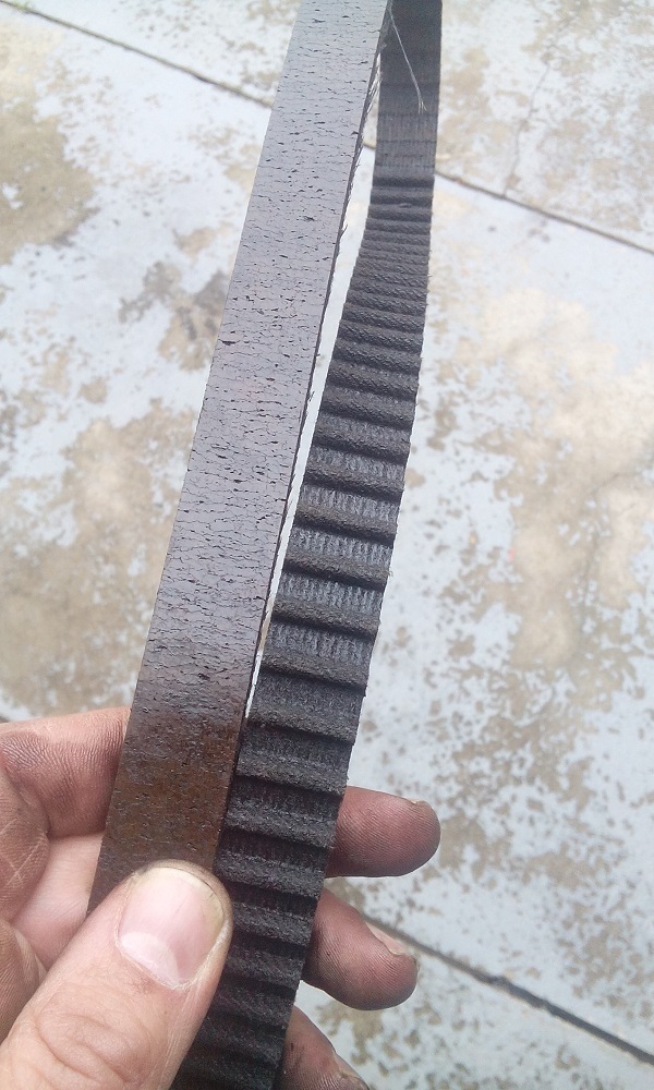 Fakt nevím, co bylo příčinou toho. Že ten vnitřní řemen selhal. Ještě jsem vyfotil oba řemeny na porovnání + opotřebení kazety vnitřních rozvodů. Je tam vydřená drážka cca 0,5 mm..