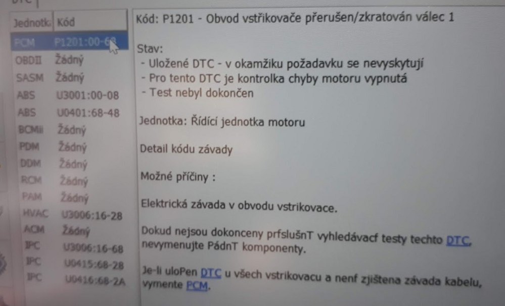 Motor sporadicky cuká, cca sekundové snižení výkonu). Teď po asi 6000 km vyskočila dvakrát chyba Engine Malfunction + ESP, diagnostika mimo jiné píše chybu P1201:00-68 (viz výpis) a auto jelo evidentně na tři válce. Má někdo zkušenosti, případně radu na co se v domácích podmínkách mrknout, než vyrazím do servisu?