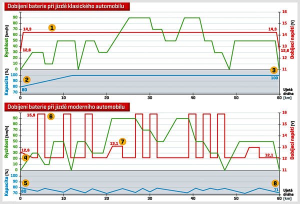 Je omyl si myslet, že už na volnoběh alternátor musí při funkci inteligentního dobíjení dobíjet. Alternátor totiž dobíjí, až když je "nabuzen" a pokud je napětí na baterii vyšší než 12,1V, tak řídící jednotka při funkci inteligentního dobíjení (a pokud auto nebrzdí motorem) neumožní buzení alternátoru a alternátor nenabíjí.