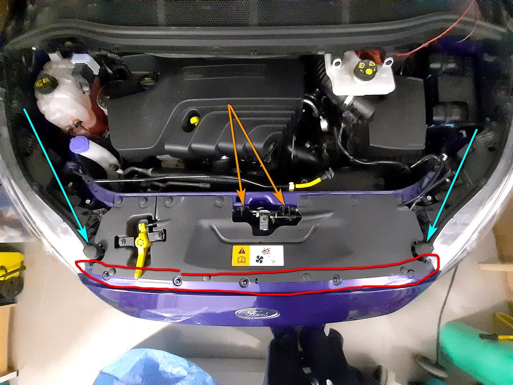 Abych si mohl pomoct akuvšroubovákem, bylo nutné auto kousek zvednout - stačilo to z jedné strany. S demontáží mi moc pomohla krabice podobné výšky, jako je výška nárazníku nad zemí. Jde to pak v pohodě v jednom člověku a docela přesně a v klidu. Po sundání nárazníku jsem zjistil, že příčka, na které je zavěšen je z každé strany na dvou šroubech. To mi umožnilo pozvednutí nárazníku cca o 3-4mm. Ještě jsem zkoumal co a jak dál, tak jsem cvičně demontoval i světla. Ale nic, co by stálo za řeč jsem z pohledu toho, co mě zajímalo, nenašel. Po pozvednutí příčky to bylo lepší, ale jen o trošku. Po delším laborování jsem to vzdal, slícoval co z hlediska těchto šroubů (samostatné foto, červené šipky), šroubů držících nárazník (červeně), nastavení zámku (oranžově) a nastavení pružných dorazů (modře) šlo a vrhnul se na hrubou sílu. Kapotu jsem v rámci možností přihnul na obou stranách u světel a světe div se, výsledek je docela v pohodě. Nakonec tato metoda byla účinnější. Do ničeho jsem nemlátil, čistě ruční práce. Dlaně, prsty + síla.