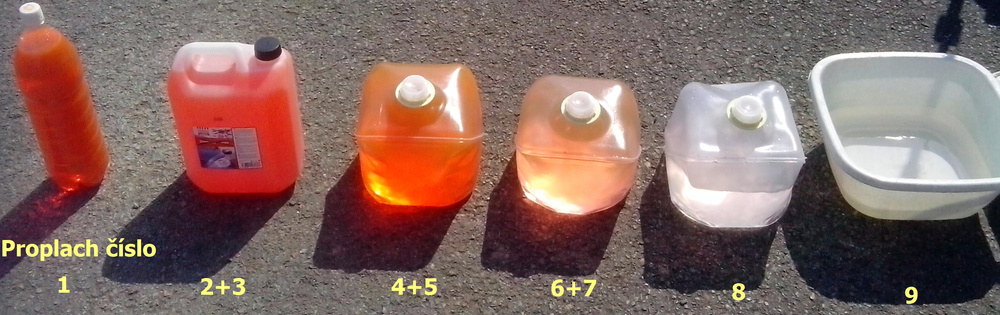 V mém případě jsem provedl 9x propláchutí, dokud opravdu netekla čistá destilka. Mohlo by to být možná redukováno na 6-7 proplachů, protože jsem to zpočátku dělal moc rychle, později jsem si všiml, že je opravdu nutné nechat běžet motor minimálně 10 minut, aby se otevřel termostat do vnitřního okruhu, hladina pak skokově poklesne a topení uvnitř začne foukat teplý vzduch. Po posledním proplachu (kdy v systému zbyla jen destilka) jsem měl co dělat, abych tam nacpal ty 3 litry koncentrátu (opět jsem to musel nechat chvíli běžet).
