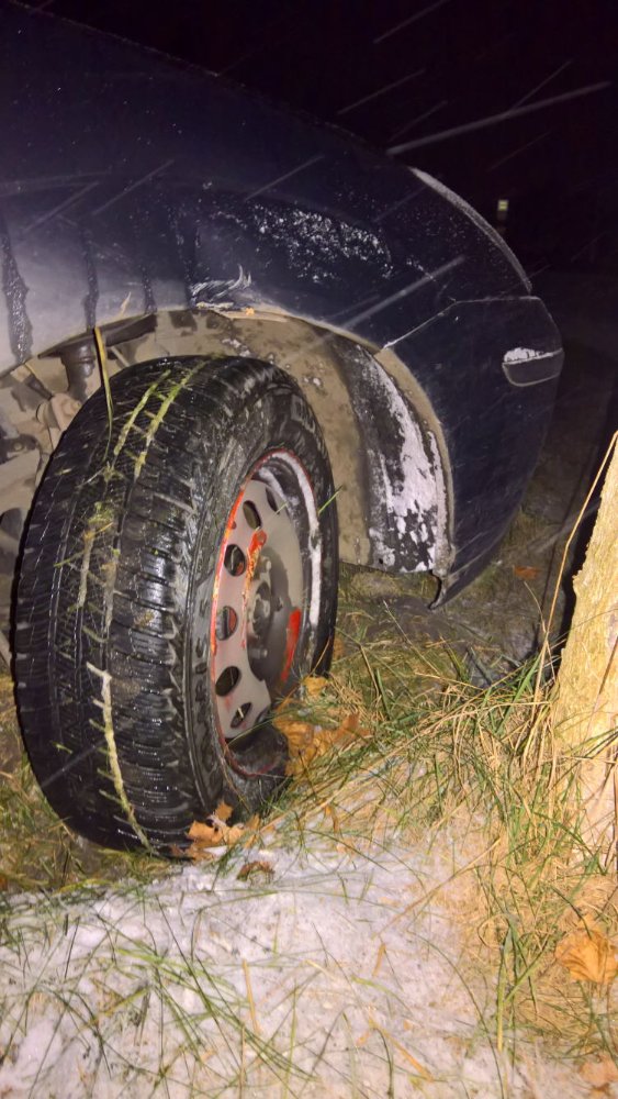 zadní gumy na odpis, 45km/h mi přišlo málo a po předjíždění jsem trochu zpomaloval. Urval se zadek a zrovna jsem to strašně zaspal, takže první reakce noha z plynu tim mi to švihlo hodně napravo, pak jsem to zkusil pod plynem srovnat, nalevo trochu líp, ale jelo proti mě auto a já byl přes celou silnici, tak jsem se po... a zahamoval jsem brzdu a při třetím vyhození jsem vycouval a trefil stromek. Popojel jsem tak 10m po poli škarpa je tam minimální, kdyby nebyl ten stromek tak tam odsud odjedu.