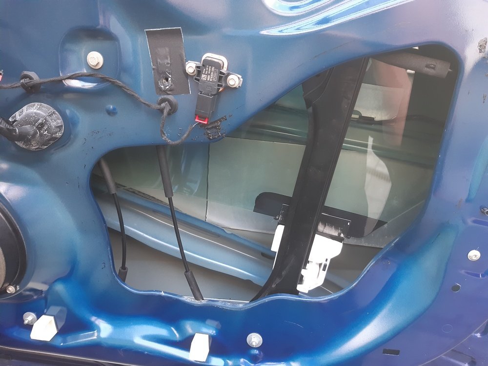 Plech dveří zevnitř a membrána - antivibrační materiál. Pečlivě nalepíme membránu a nalepujeme pláty. Vše co je možné je lepší z plechu domontovat nebo vycvaknout a pak to po lepení vrátit zpět..