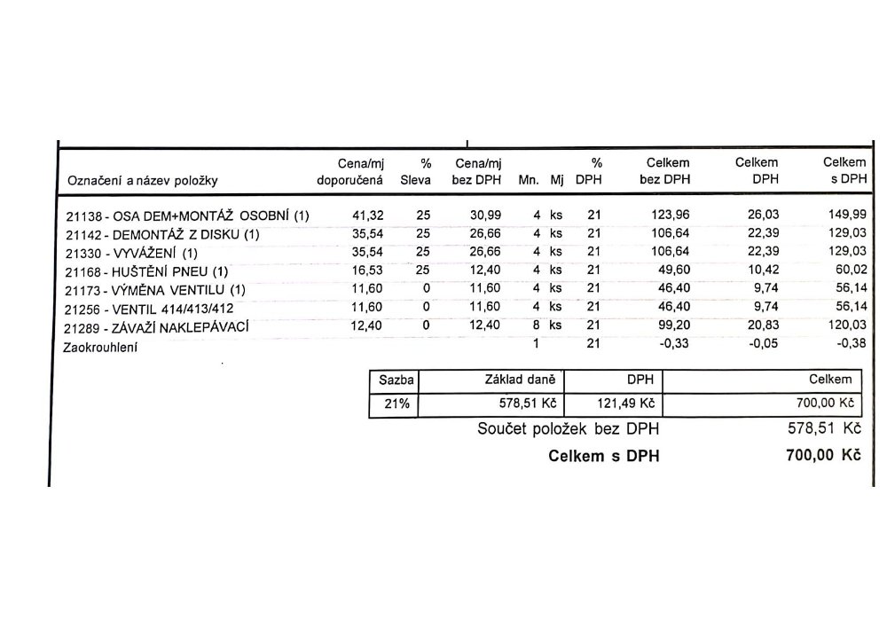 Prisel kolega v praci a rika, clovece menil jsem ventilek na pneu a kdyz jsem prijel do servisu, tak rikam at vymeni vsechny 4. Takze kola dolu z auta na shazovacce to zmackl a vymenil ventilek(na kazde) no a pak prevazeni a znovu na auto, cena 700Kc