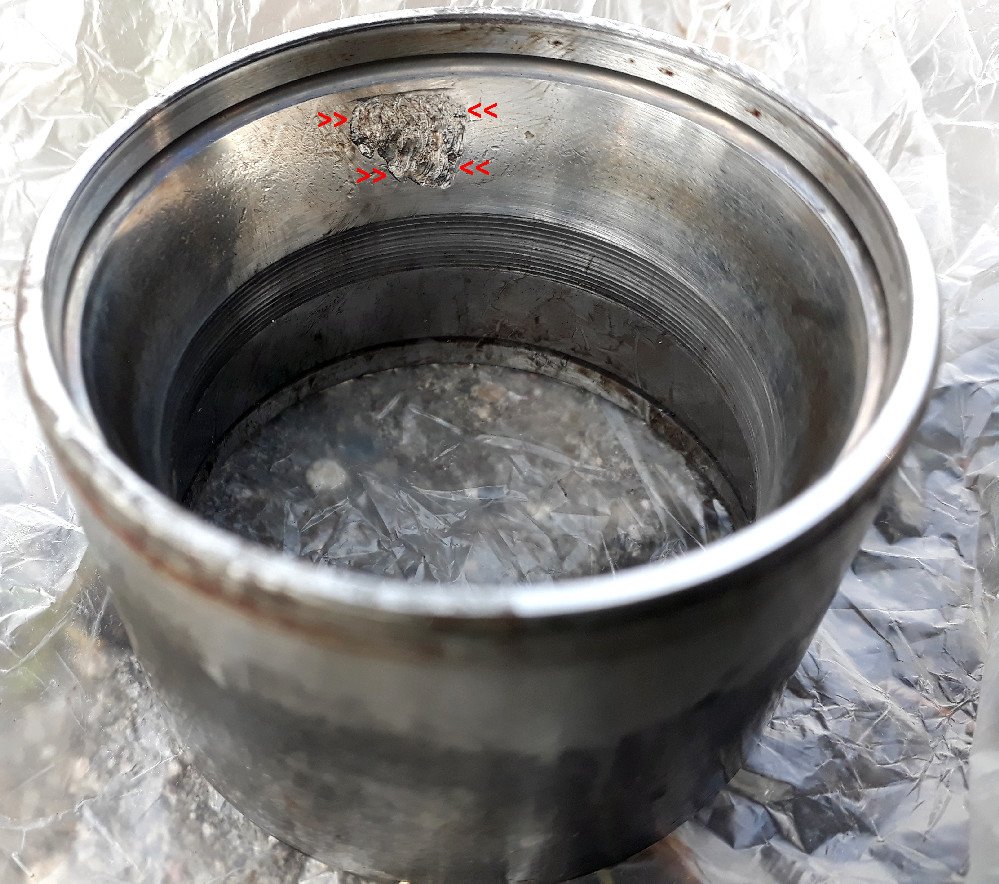 Jinak hlavní příčinou toho selhání ložiska byl (podle mého) průnik vody a nějakého prachu od brzd do ložiska (v místech, kde jsou na obrázku červené šipky). Po průniku nečistot pak došlo k vydření části kluzné plochy (cca průměr 1cm). Když pak válečky přejížděly přes tuto nerovnou plochu, tak to hučelo.
