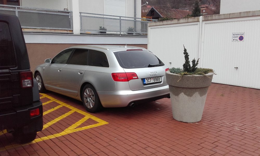 Nechápu, už jsem to tu psal víckrat. Zluty čáry, značky všude a stejně to tam nechá. No, tak asi majitel garáže to nedal a trochu jí to obstavil. To tam vedle z boku byl ještě kontejner.