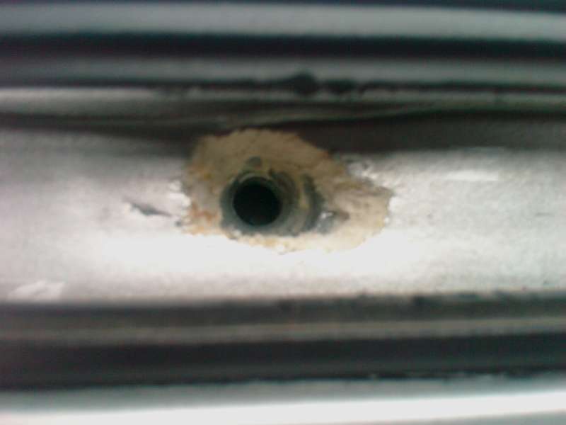 Velmi opatrne vyrezte uprostred otvoru dieru s priemerom asi 1 cm. Pamatajte, cim menej silikonu vydlabete, tym lepsie! Dostante sa az na pod vrstvu silikonu. Pokial ste narazili na kov (strechu), je zle. Pokial ste objavili plast, ste na dobrej ceste. Je to taka loteria, lebo diera sa nemusi zakonite nachadzat presne uprostred. Napriklad u mna boli oba zadne cca. o 1 cm vychylene.