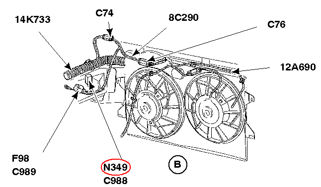 Podle čísla součásti(92AB 8B607-AA, finis 7001611) je to "Spínač - motor větráku" a je použit, bohužel z výkresu nejde poznat, kam přesně má přijít. Ve schématech chlazení jsou ventilátory ovládaný pomocí dvou relé a jeden z ventilátorů ještě paralelně tímhle termospínačem. Jde mi o to, jestli ten termospínač má být někde zašroubovaný v systému chlazení(může se někdo mrknout do svého motoru?), tady jsem ho našel na nákresu: