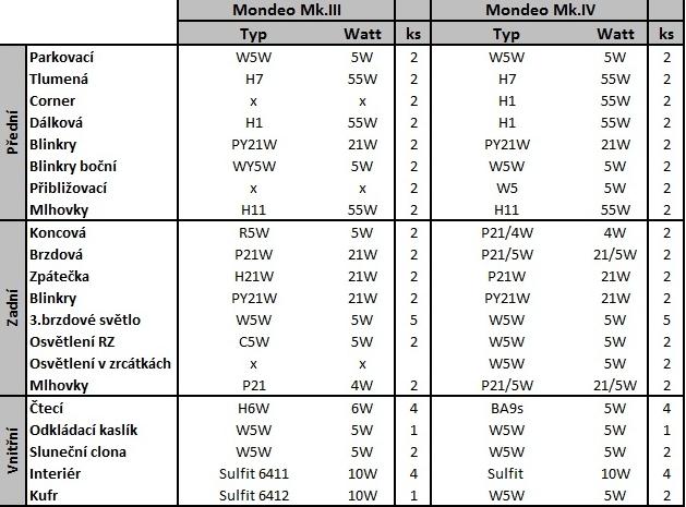 tady máme textový seznam od uživatele HonzaK72 pro Mondeo MKIII a MKIV Přední světlomet halogen: tlumené H7 + dálkové H1 + parkovačky W5W + blinkry Ba15S Přední světlomet xenon: tlumené D2S + dálkové H1 + parkovačky W5W + blinkry Ba15S