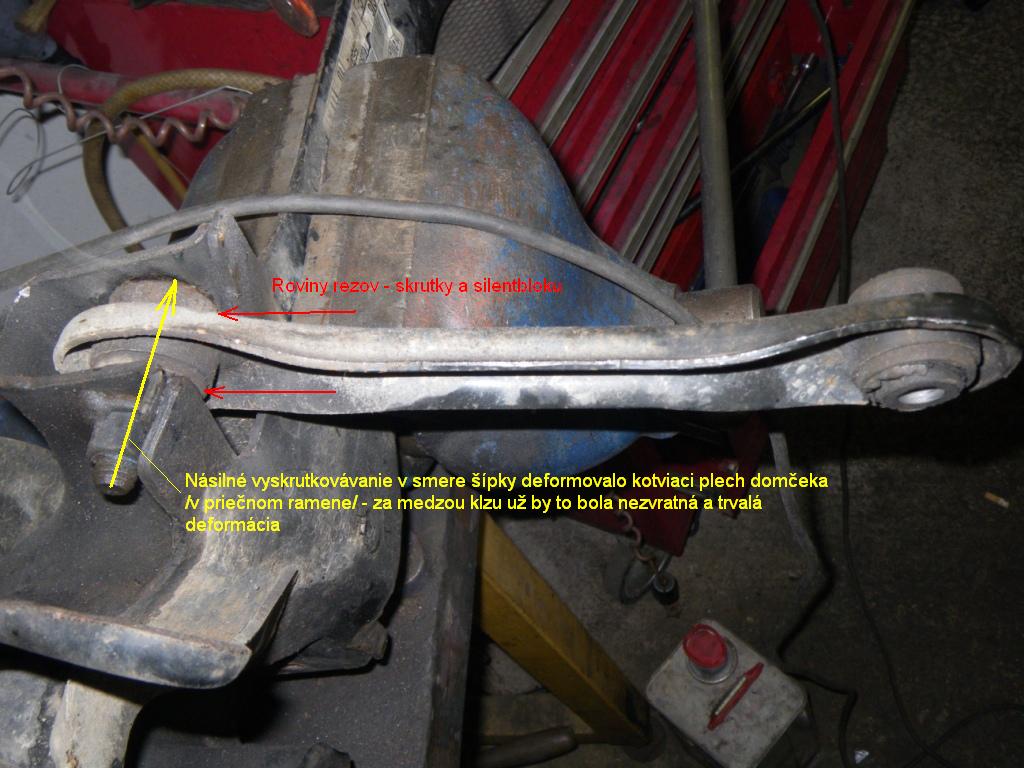 No úplne všetky nie - nemenil som tie čo sú v tom spodnom priečnom ramene (Ľ+P) - jeden /silentblok/ je kotvenie v pozdĺžnom ramene vzadu a druhý bod/silentblok/ je v uložení nápravnice s excentrom - skrutkou s excentrickou hlavou, ktorej natáčaním sa nastavuje zbiehavosť zadných kolies. Oba nemenené silentbloky sú zalisované v tom priečnom spodnom ramene zadnej nápravy v ktorom je i spodná miska pružiny.