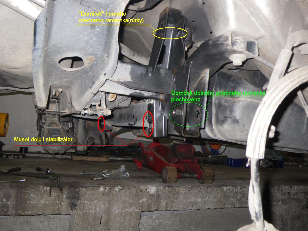 No úplne všetky nie - nemenil som tie čo sú v tom spodnom priečnom ramene (Ľ+P) - jeden /silentblok/ je kotvenie v pozdĺžnom ramene vzadu a druhý bod/silentblok/ je v uložení nápravnice s excentrom - skrutkou s excentrickou hlavou, ktorej natáčaním sa nastavuje zbiehavosť zadných kolies. Oba nemenené silentbloky sú zalisované v tom priečnom spodnom ramene zadnej nápravy v ktorom je i spodná miska pružiny.