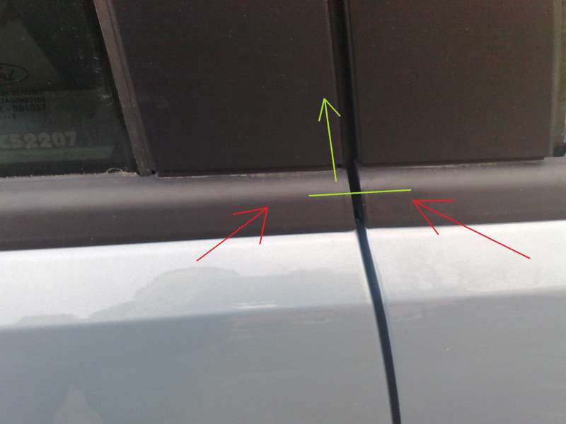 Inak ale zaujimava vec. Vcera som zistil, ze na vsetkych 4-ch dverach, tesniaca guma (ci co to je) oznacena na obr. cervenou sipkou) ma tendenciu "vyskakovat" - vysuvat sa smerom hore (zelena sipka) az priblizne pol centimetra az centimeter. Zalezi od dveri. Na fotke su v zatlacenej (spravnej asi) pozicii. Staci zatlacit a zapadne to tam. Ale po jazde sa to vysunie trosku.