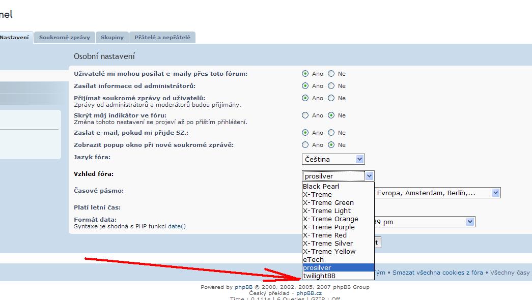 uz asi vim, o co klukum jde .. pokud se prepnes do stylu twilight, tak ti v zahlavi fora automaticky zmizi odkaz na uzivatelskej panel, takze nemas moznost se dostat na nastaveni, ani na SZ .. jedina moznost, ktera tam je, je odhlaseni