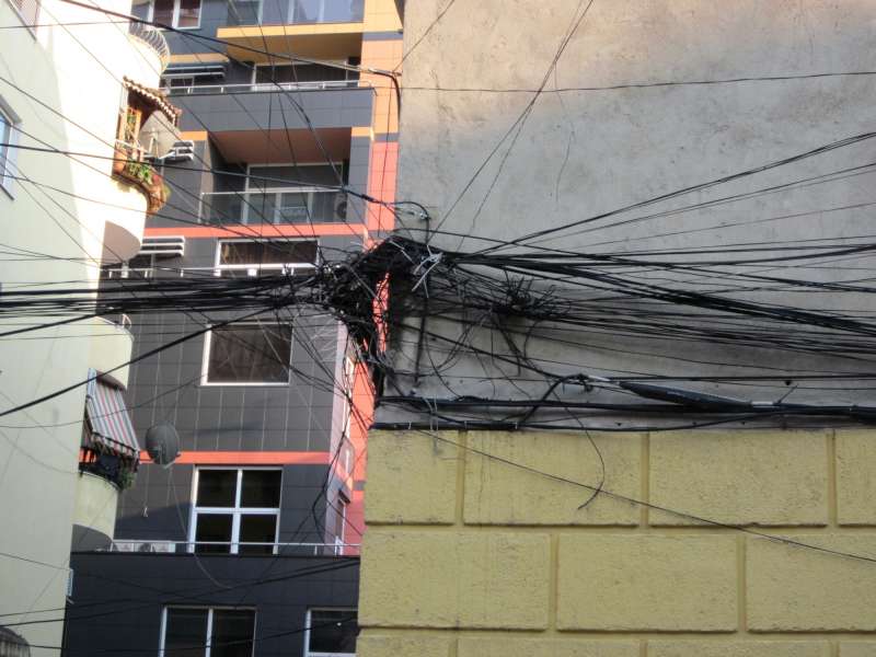 Podobnej bordel je i v telekomunikacích - toto je telefonní rozvod v centru Tirany..