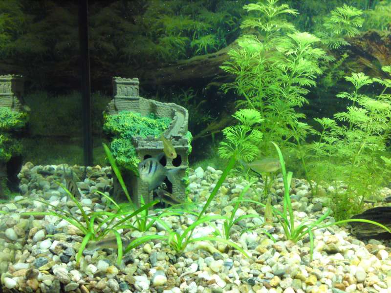K tomu písku ... toho je tam jen trocha. Ve většině akvárka je tmavej štěrk, kterej jsme tam měli vždy, jen jsme teď udělali na dně z toho světlýho písku takovej "ostrůvek", kterej nepřesahuje 30% plochy a hlavně v tom písku jsou postavený kořeny a jsou v něm i rostliny, takže je ho i hodně zakrytýho.