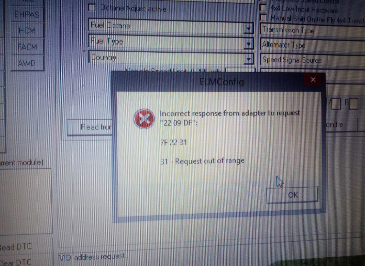 caute... po vymene alternatora som to chcel dnes pozriet v elmconfig, menil sa zo 120A na 150A a nechce mi nacitat tu druhu stranku kde je udaj o alternatore... doteraz to fungovalo bez problemov, neviem co znamena tato hlaska INCORRECT RESPONSE FROM ADAPTER TO REQUEST 22 09 DF 7F 22 31 31-REQUEST OUT OF RANGE