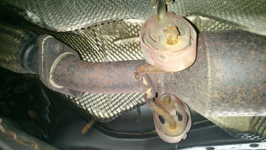 Přikládám ještě fotku něčeho co jsem našel dole. Jsou tam nějaké dvě "kulaté gumové věci", které mají být připevněné k výfuku zhruba v polovině podvozku auta a jedna z nich je utržená. Určitě to není správně, ale nedomnívám se, že ten rachot dělá právě toto. Přesto to radši posílám.