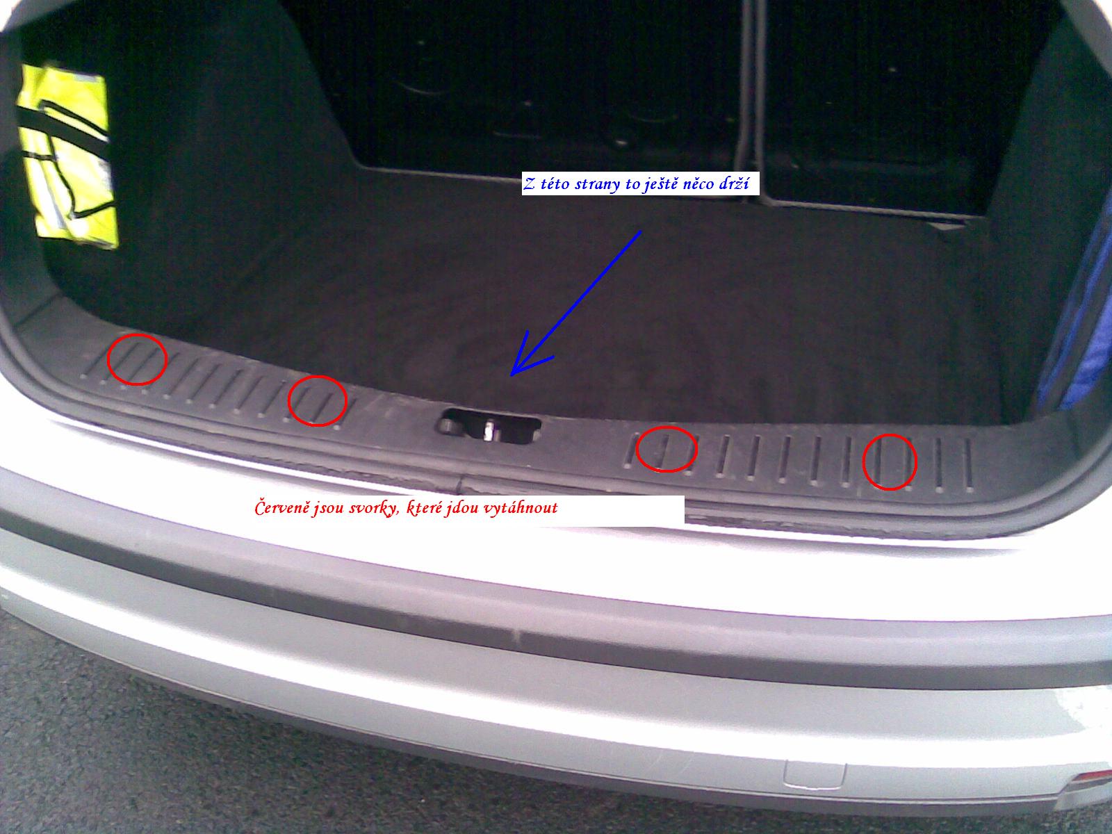 Jedná se o osazení plastu na obrázku. Je to práh kufru. Na obrázku jsou vyznačeny čtyři místa, která jsou ke karoserii přichytnuta takovými svorkami. Ty jdou celkem lehce vytáhnout.