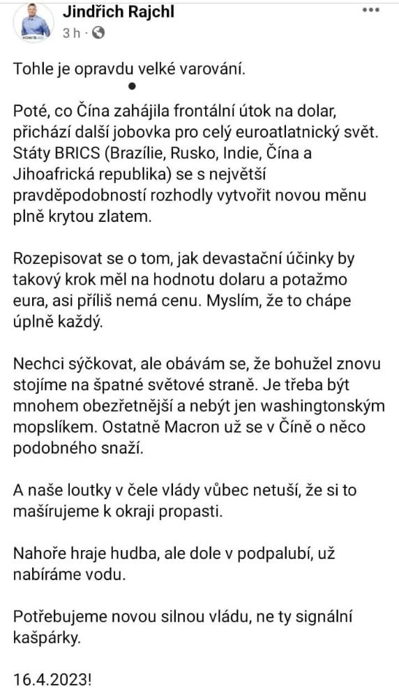 Je dobrej lhář a méně chápavá část obyvatel mu to žere.Žádná z jeho katastrofických vizí nevyšla.Bez plynu z Ruska a též jadernýho paliva odtamtud se obejdeme,paliva nestála a nestojí stovku za litr,měna plně krytá zlatem je holej nesmysl atd atd.Když jsem se sním snažil vést diskusi a vyvrátil jsem mu ty nesmysly dostal jsem ban😂.A tihle řvou proti cenzuře a oponenty banujou,stejně jako Okamura,Zwyrtek a jiní exoti.
