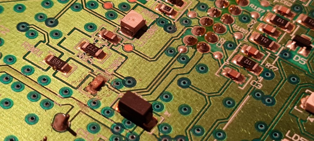 Vzhledem k tomu co se tu poslední dobou probírá, jsem při včerejší opravě dalších budíků vyfotil častý problém. A sice "lehkou" oxidaci. Bývá tam často, na různých místech a v různém rozsahu. Zásadní je hlavně u kondenzátorů, které jsou ukostřené. Někdy je oxidace vidět pouhým okem, někdy je potřeba lupa, nebo i mikroskop. Je důležité ji za použití vhodné chemie očistit a také "zakonzervovat". Jsou na to různé chemické přípravky, které mají za úkol chránit desku. Několikrát jsem i hledal jestli do auta neteče a většinou jsem nic nenašel. Vypadá to, že problém vzniká kondenzací v kombinaci se špínou (prachem) pod palubkou.