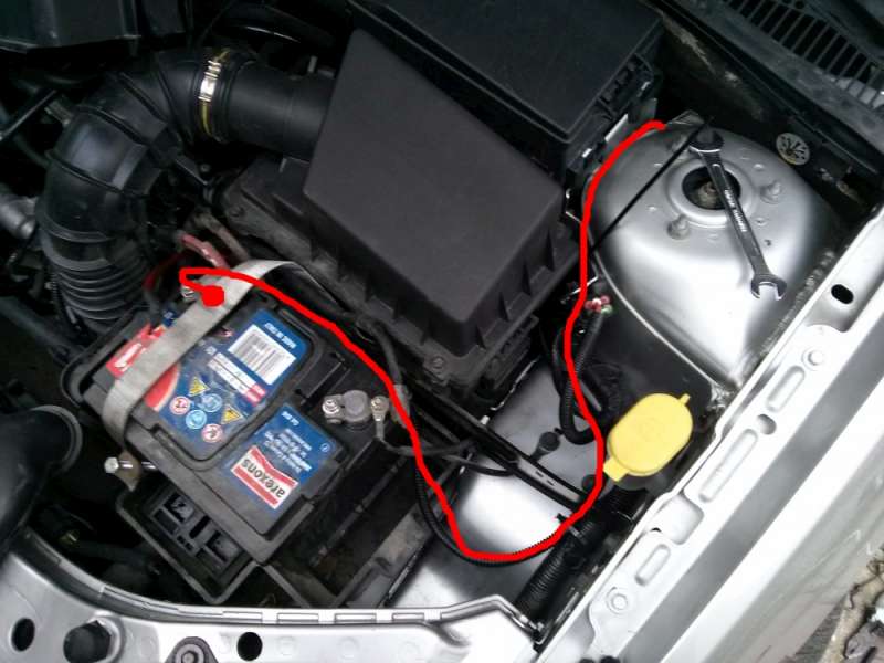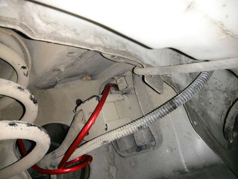 V místě červeného kolečka sem vyvrtal díru odpovídající průměru kabelu od akumulátoru.