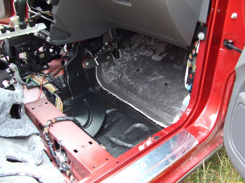 Pod nima je v místě pro nohy taková jakoby guma, která se táhne až za palubní desku a není ji teda možné odstranit. Pod gumou je už jen plech s obligádní trochou tlumení z výroby aby se neřeklo.