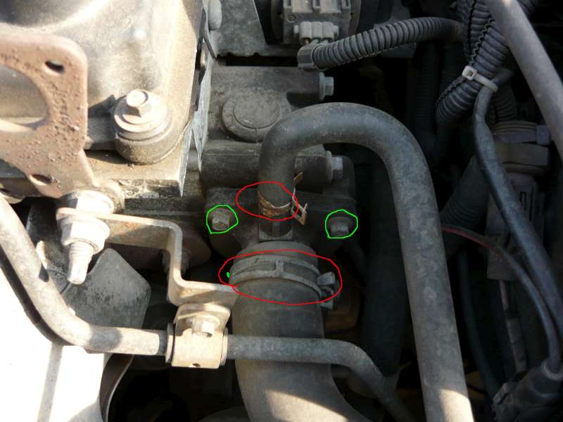 ZULU_CZE: K té výměně termostatu, já si ho na své 1.8i měnil a není to nic složitého. Přidám ti sem foto, abys viděl co demontovat. Nejdřív si odpoj obě hadice (červeně poznačeny) a pak povol 3 šrouby (zeleně poznačeny). Ten třetí šroubek je pod tou silnější hadicí, takže na fotce nejde vidět. Sundáš kryt domečku a uvidíš samotný termostat.