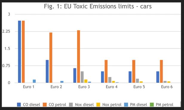Tyhle grafy říkají hodně, hlavně je hezky vidět, že u benzínu Euro 4-6 není zase takový rozdíl. Mezi Euro 2 a 3 se změnila metodika měření (od Euro 3 start se studeným motorem), limity zůstaly podobné.