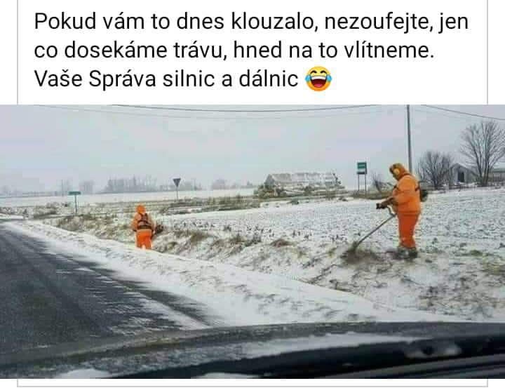Aspoň teda tady na prostějovsku...venku na silnici mezi obcemi 10cm+ a ani sůl nic...ale loni to když byl poprašek tak se mohli na silnici pomlátit...
