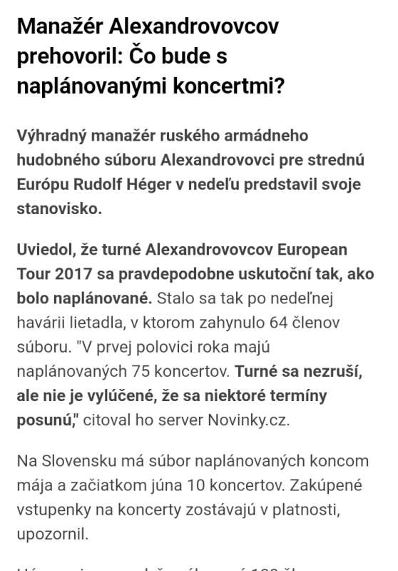 Myslim, ze zpevaku maji zasoby. Za kazdeho tam maji ihned nahradu, toho bych se nebal.FLA píše:no je to rusky národný sperk, tak ani taketo nestastie ich nezstavi, ako rychlo daju dokopy zbor tazko odhadovat