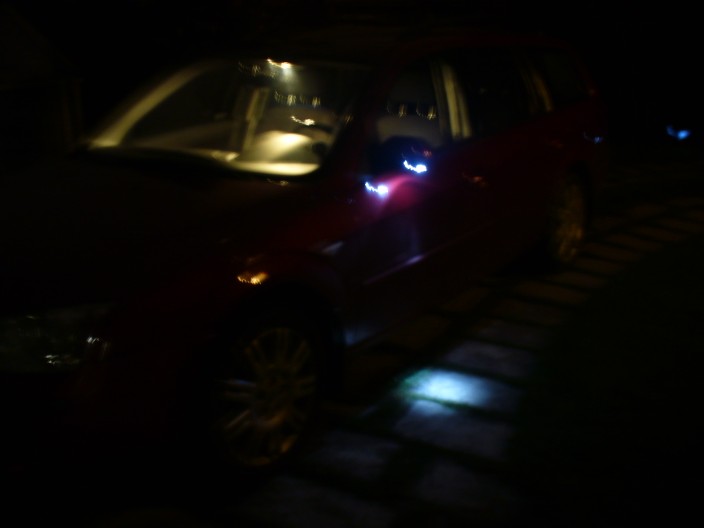 Tak jsem si opět zase trochu hrál.....udělal jsem si osvětlení prostoru u dveří ve venkovních zpětných zrcátkách,,,jsou tam dané vysokosvítíve LED diody-jedna do každého zrcátka,,,a řeknu vám byla to teda krutá práce protože jsem přidával piny do konektoru ve dveřích a ten prostor no ,,,DĚS A HRŮZA,,ještě ted mám ruce pomačkané a pořezané od plechu ALE ten výsledek přece stál za to a vzhledem k tomu že jsem měl reklamované dveře kvuli korozy tak musely byt oddělatelné a proto jsem to dělal přes konektory,někdo by tam možná dal kabel a hotovo ale to jsem nechtěl. NO A TEN VÝSLEDEK STÁL ZA TO ,,, posudte sami ,,,