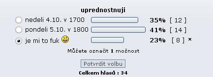 ohledne hlasovani: i pres velkou snahu priznivcu vikendu vyhralo pondeli. misto bylo rozhodnuto v prubehu tydne - oc chodov. timto se tedy oficialnim datem stava 5/10/2009 v 1800
