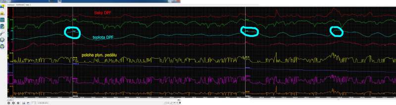Grafy. Ovšem na LCD jsem na živo viděl něco jiného! To bych odpřisáhnul. Dost to připomínalo vlnky ve větru, jak je kreslí děti. Možná rozlišením a zobrazením na jiném LCD... Maximální oblasti teplot DPF jsem zakroužkoval. No... Tak ještě se bude asi měřit.