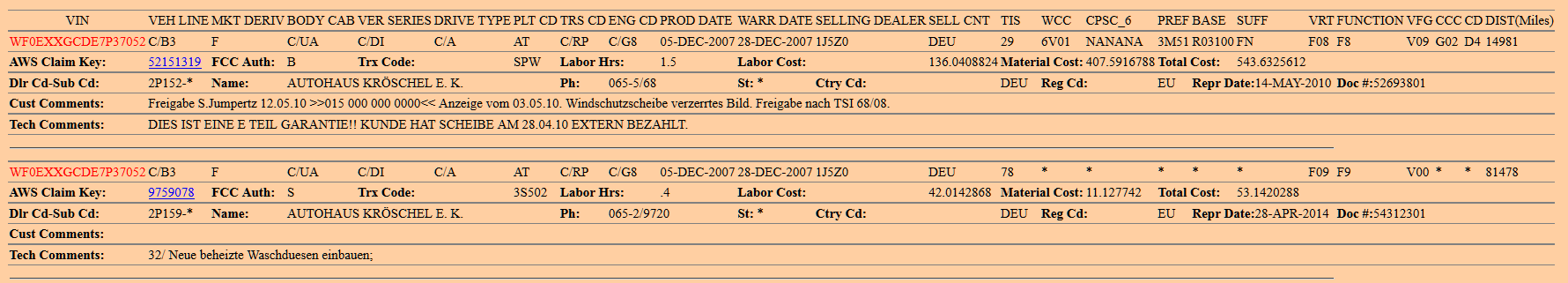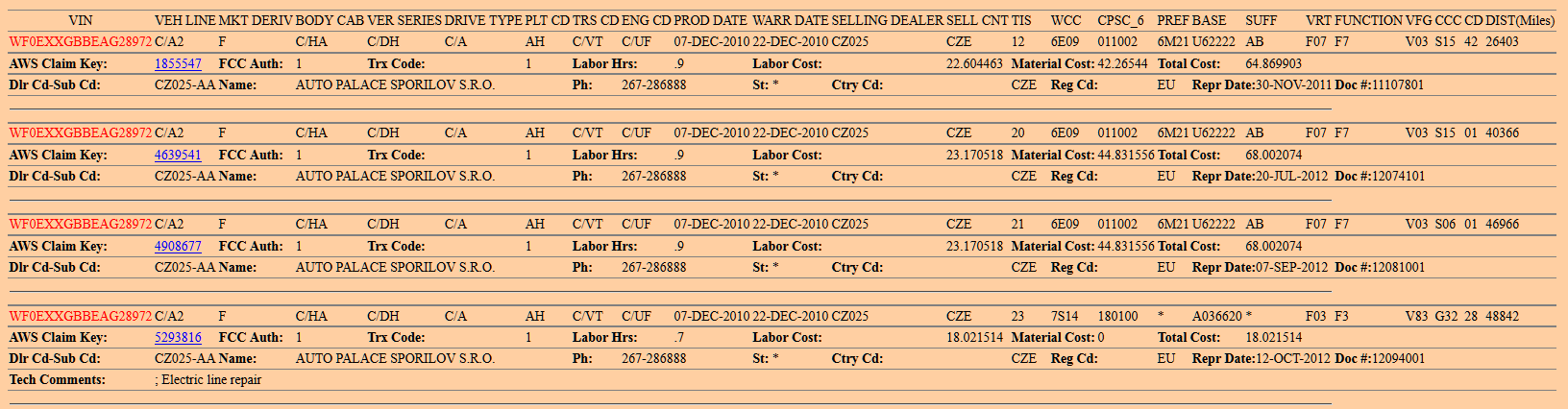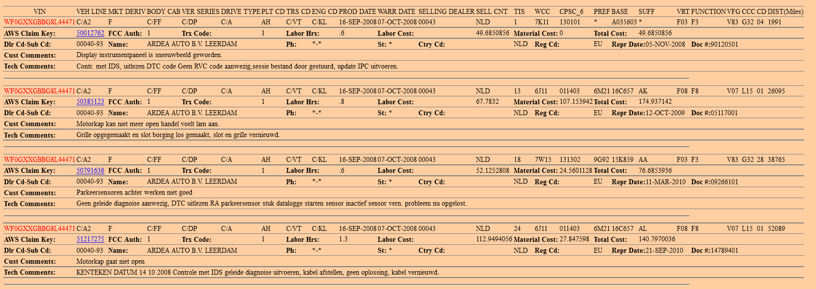 bylo by prosím možné zjistit více o tomto VIN: WF0SXXGCDS8L31206 (případné záruční opravy apod?)