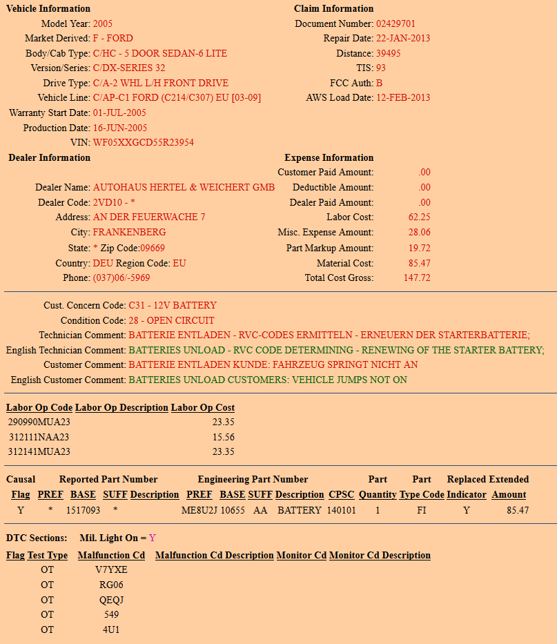 podle CEBIA má 2 záznamy a dle fordzony 1 záruční opravu.