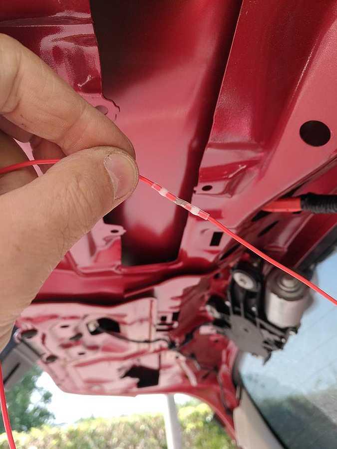 - já jsem při té příležitosti zjistil, že krajní konzole na liště jsou v horní části odlomené, tak jsem použil tmel na motory, který by mi jinak zaschnul: - protože dneska byl hic, podařilo se protáhnout konektory i spojka tou malou gumovou záslepkou (záslepka je velká, ale dírka malá), aniž bych ji roztrhnul. Nejdřívě šel větší (žlutý cinch), pak menší (červený napájecí) a nakonec spojka: - konektory jsem zaizoloval, aby se mi samovolně nerozpojily: - protože mi pájení moc nejde, používám takovéto spojky, které jen zatavím horkovzdušnou pistolí: - kostru jsem nikde netahal, protože páté dveře ukostřené jsou. Takže takto: - zvolil jsem levou stranu pro protažení kabelu (v zásadě je jedno, jestli zvolíš levou, nebo pravou stranu auta pro protažení) - pokud to šlo, nevycvakával jsem plasty za každou cenu, takže zde jsem stropnici jen poodhrnul a pomohl si háčkem - povolil jsem dva šrouby na levé straně kufru platu u světla interiéru a malinkato povycvaknul. Pak šel kabel prostrčit. - z LZ místa spolujezdce jsem prostrčil vázací drát s očkem kolem světýlka a protáhnul kabel do kabiny