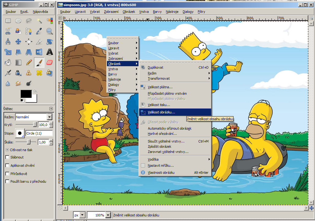 [2] pravym tlacitkem mysi klikneme na otevreny obrazek a vyberem z nabidky Obrazek - velikost obrazku [3] zadame pozadovanou velikost (150 pixelu) do jednoho policka, druhe nechame "svazane" s prvnim [4] zmackneme Skalovat