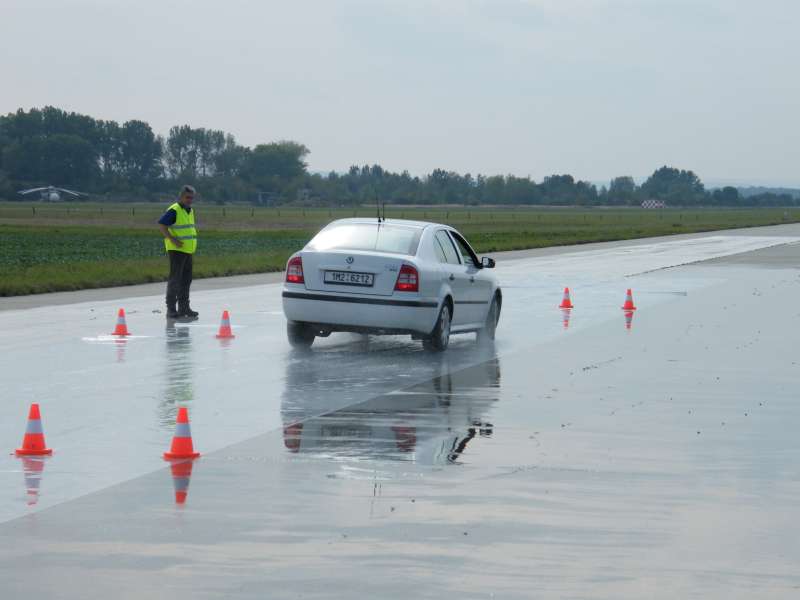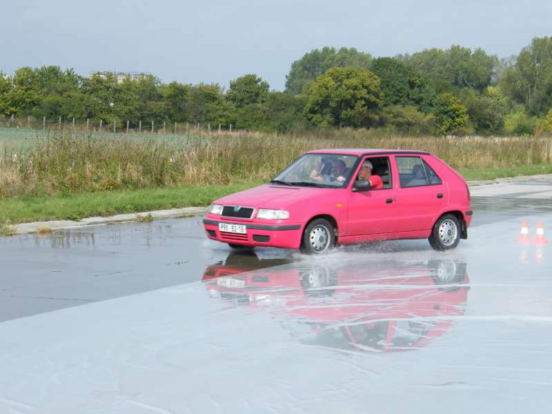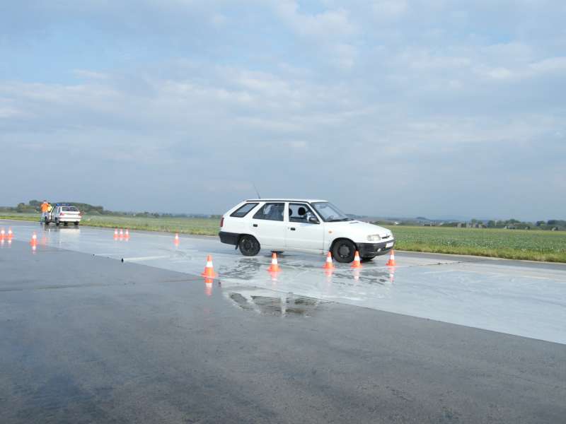 Nejdříve jsme si vyzkoušeli nácvik intenzivního brždění s pootáčením volantu, pak slalom bez brždění s vyšlápnutou spojkou, hodiny, přerušované brždění a na závěr vyhýbací manévr na obě strany.