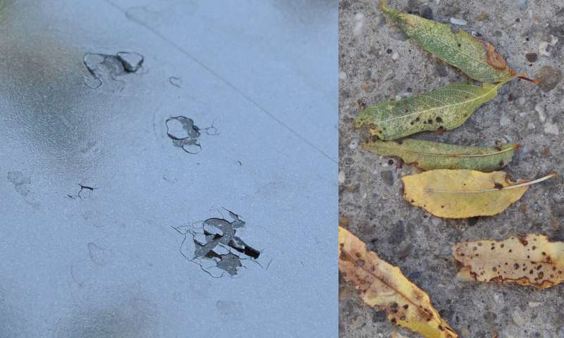 Plody tohto stromu sa mi posobenim tepla prilepili o kapotu, cestou domov sa namocili v dazdi a potom sa opat vysusili na kapote. Ked som druhy den po navrate z dovolenky umyval auto vapkou zistil som velmi neprijemnu vec. Gel ktory ostal z plodov uplne rozozral lak auta. Prikladam fotky skody a tiez posledne listy ktore ostali pod kapotou (ostali len tie suche
