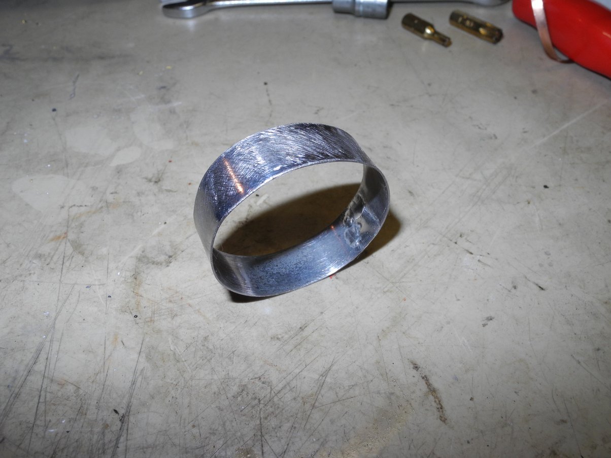 1) Kroužek z nerez plechu, tl. asi 0,3mm, šířka cca 13mm, délku jsem odměřil tak akorát, aby to vytvořilo kroužek, co jde tak akorát vsunout do otvoru (nemusí jít úplně těsně) a spájel (použít vhodnou kapalinu) - spájení je důležité, kroužek "v celku" bude lépe držet: 3) Kroužek jsem vlepil (vše zdrsnit, odmastit) do tělesa termostatu, stačí tenká vrstva lepidla - použil jsem osvědčené dvousložkové epoxidové lepidlo JB Weld s velkou teplotní odolností (280°C). Šlo by určitě použít podobné lepidlo, případně i nějaký tmel (silikon nebo raději hybridní polymer), akorát dbát na teplotní odolnost - jde jenom o zafixování kroužku, pokud má správný rozměr, bude tam dobře držet sám.