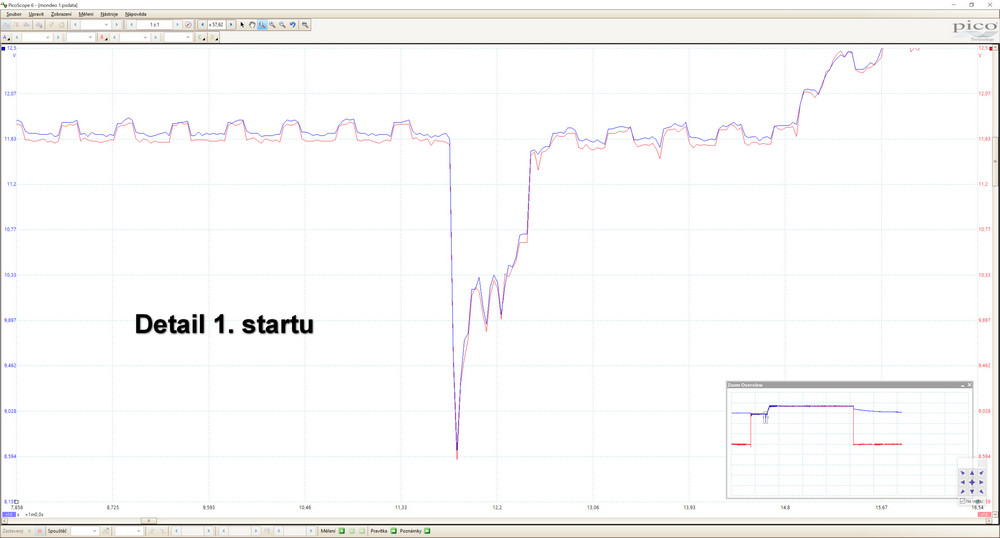 s přituhujícími mrazy tu mám jeden aktuální dotaz. Před nedávnem jsem zjistil že mi na Mondeu mk5 nevyhřívá přední okno (když jsem auto koupil fungovalo to normálně). Obě 40A pojistky jsou OK, vyhřívání zadního okna i sedaček funguje. Den předtím jsem akumulátor nabil a poté ujeto cca 50km v kuse. V manuálu se píše o tom, že když je vybitý akumulátor tak se vyhřívání nemusí aktivovat. Bohužel ani od zákaznické podpory fordu jsem se nedozvěděl jakým způsobem auto pozná že je akumulátor vybitý. Dostal jsem jen standardní odpověď: Zajeďte s vozem do autorizovaného servisu. Protože tuším jak by to dopadlo, tak se nejdřív zeptám zde :) .Přidávám pár obrázků průběhu napětí měřeného na dvou místech. V zásuvce u řidiče a na svorkách baterie. Chtěl jsem ještě přidat měření proudu, ale nemám kleště co by se daly nasadit na kabeláž, snad příště. Když jsem zkoušel po nastartování zapínat různé zátěže, vše se zdálo být v pořádku. Nenaměřil jsem žádný pokles napětí, altík tedy evidentně dobíjí jak má.