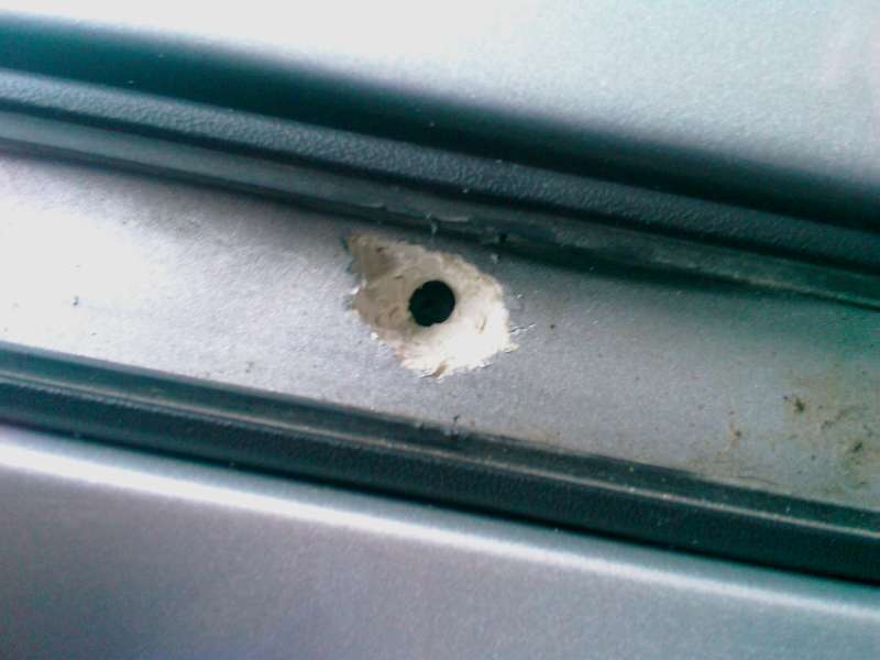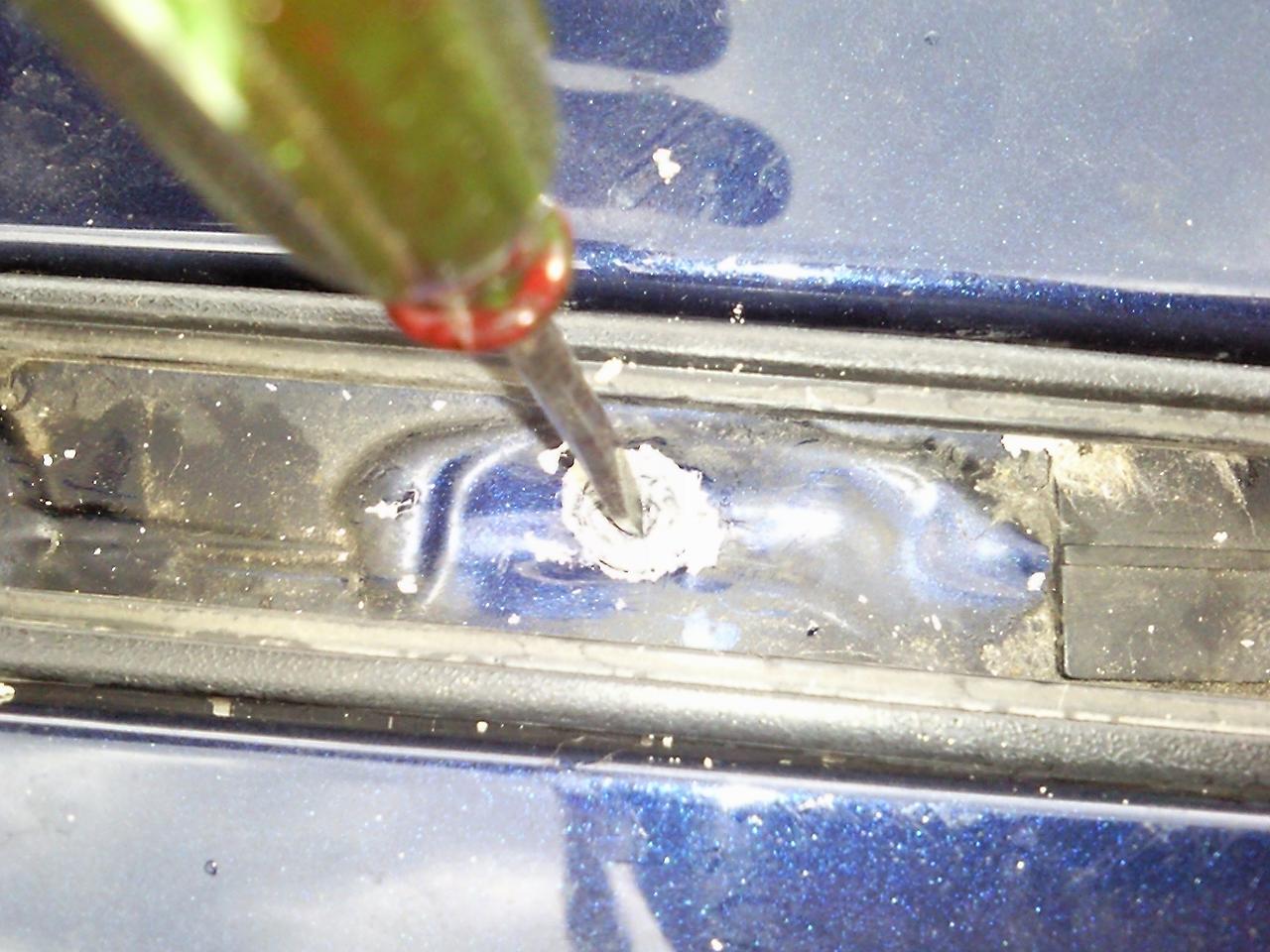 Velmi opatrne vyrezte uprostred otvoru dieru s priemerom asi 1 cm. Pamatajte, cim menej silikonu vydlabete, tym lepsie! Dostante sa az na pod vrstvu silikonu. Pokial ste narazili na kov (strechu), je zle. Pokial ste objavili plast, ste na dobrej ceste. Je to taka loteria, lebo diera sa nemusi zakonite nachadzat presne uprostred. Napriklad u mna boli oba zadne cca. o 1 cm vychylene.