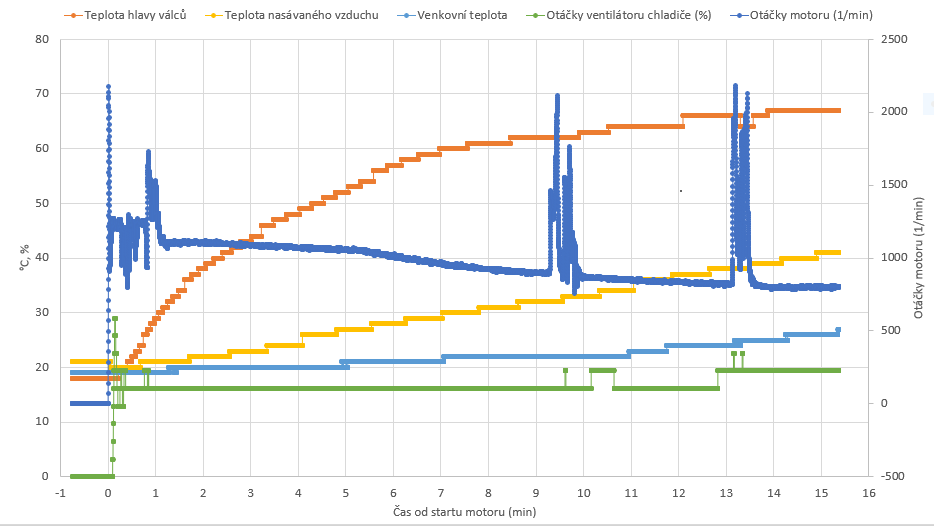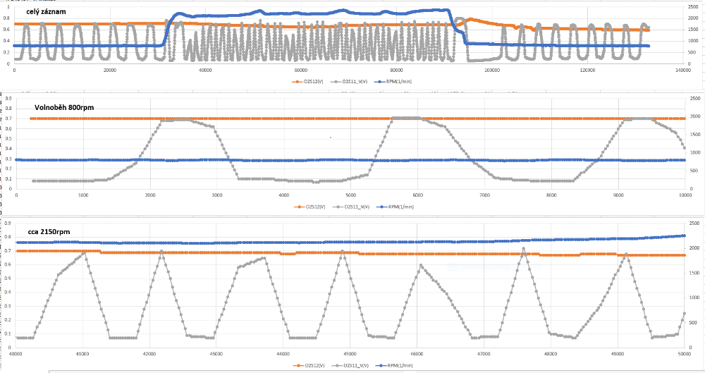 Změřená data z lamba sond viz příloha - na grafu je spodní osa čas v ms, levá osa napětí na sondách (šedá křivka OS211 - sonda před katalyzátorem, oranžová křivka OS212 - sonda za katalyzátorem), pravá osa otáčky motoru v 1/min (modrá křivka RPM). Rozsah hodnot je v pořádku, to by mi hlásila chybu i diagnostika, kdyby nebyl, ale nejsem si jistý, zda je hlídána rychlost změny z nízkého napětí na vysoké a opačně, a zda ty prodlevy co tam mám nejsou už moc pomalé? Při volnoběhu je frekvence změny nízká-vysoká asi 1.5 sekundy, při otáčkách okolo 2100/min je to 0.5 sekundy - není to už moc? Někde jsem četl, že ta změna by měla být pod 120ms, ale to bylo obecně o lambda sondách, ne konkrétně o tomto FF. Ani ten tvar průběhu se mi moc nezdá, ale možná je to vlastně vše v pořádku, proto prosím o Váš názor. Díky