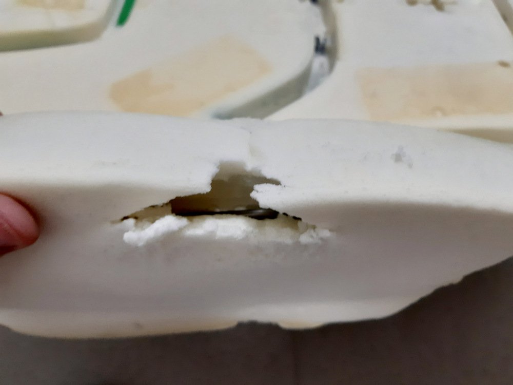 Přistoupíme k demontáži potahu ze sedáku. Tady je situace o dost jednodušší než u jiných modelů. Žádné železné kroužky - potah je pěkně zacvaknut do plastových držáčků a v oblasti vepředu uprostřed potom drží na suchých zipech. Pro sundání stačí troška násilí - je to jednoduché... Na potahu je vidět rozdrolený molitan. Na další fotce je vedle sebe starý a nový sedák. Je to docela rozdíl..