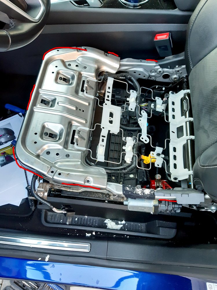 . Hned na začátek můžu napsat, že je to jednoduché. Práce asi na 2 hodinky, kdy nejvíc času sežere odlepení vyhřívací dečky z původního molitanu. Dobrá zpráva hned na začátek: sedadlo není potřeba demontovat, jde to docela v pohodě i v autě. Odpojíme konektor sedadla. Následně odšroubujeme 2x šroub (vepředu a vzadu, viz foto) bočního plastu sedadla. V oblasti nad kloubem opěradla je plast zaháknutý, je potřeba vyháknout směrem nahoru. Po vycvaknutí odpojíme konektor ovladače sedadla. Popisuju plně elektrickou sedačku, u ručního ovládání je to trošku jinak. Ale v příloze je i návod z ETISu, kde je popsáno i ručně ovládané sedadlo. Za návod ještě jednou mockrát díky jedné dobré duši.