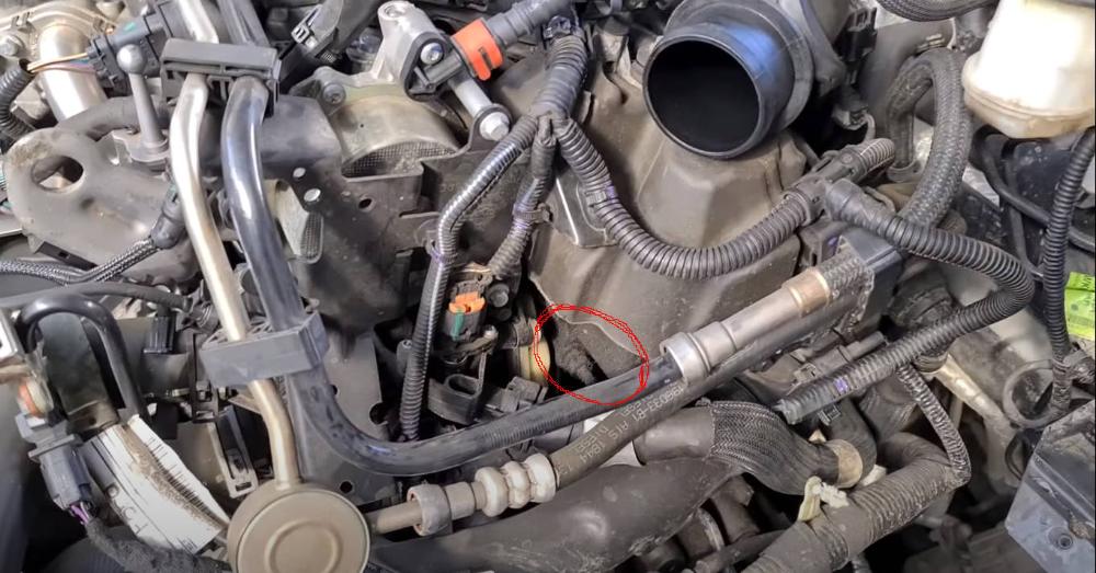 V mem aute jsem si vsiml, ze mam vlkhou cast v motoru. Presne na tomto zakrouzkovanem miste: Fotku jsem sejmul z videa na YT, protoze na mem aute je to pod tema vsema hadicema a neda se to poradne vyfotit. Jediny rozdil je ten, ze to mam o hodne min spinavy.
